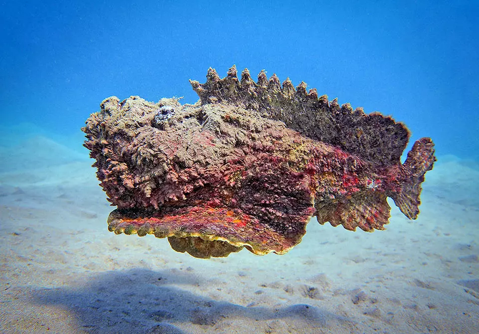 Dato curioso: Es el pez más venenoso del mundo, con espinas que liberan una toxina capaz de causar parálisis y dolor extremo.